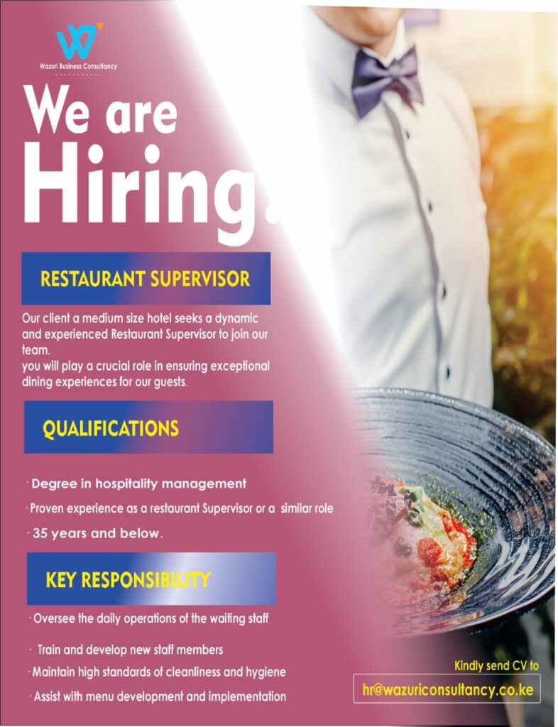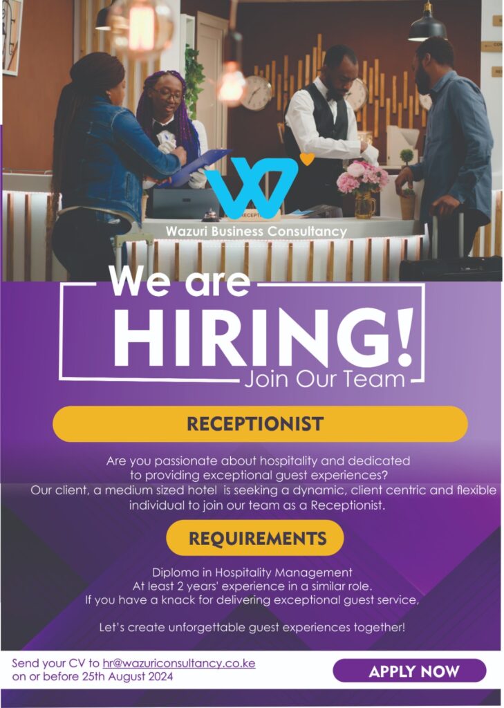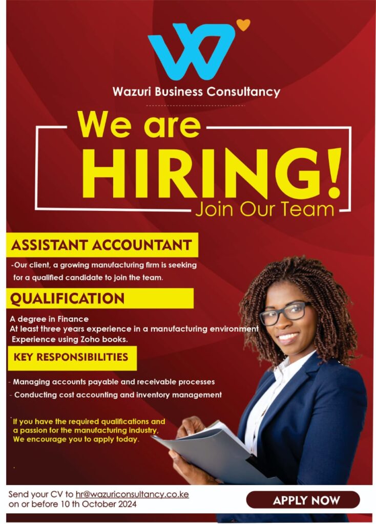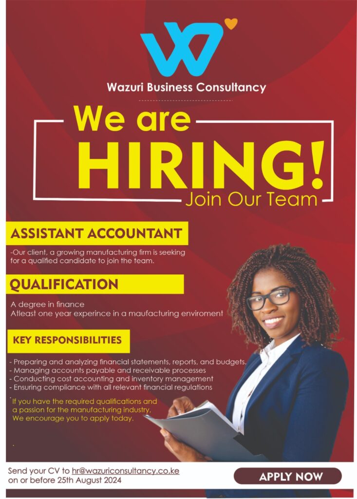 Our client a growing manufacturing company is seeking a qualified candidate to join the team Qualification(s) Key Responsibilities If you have the required qualifications and a passion for the manufacturing industry. We ecnourage you to apply Send you CV to hr@wazuriconsultancy.co.ke on or before 25th August 2024